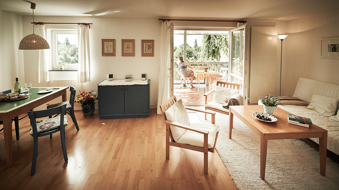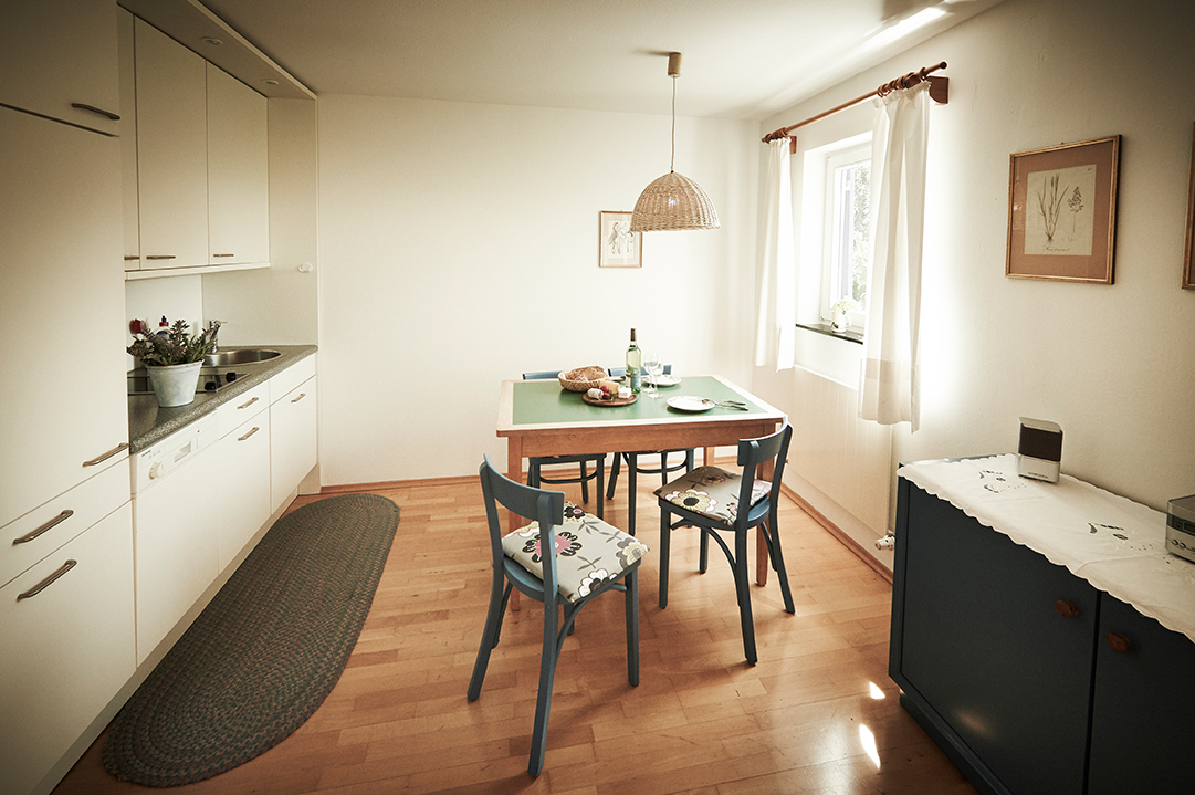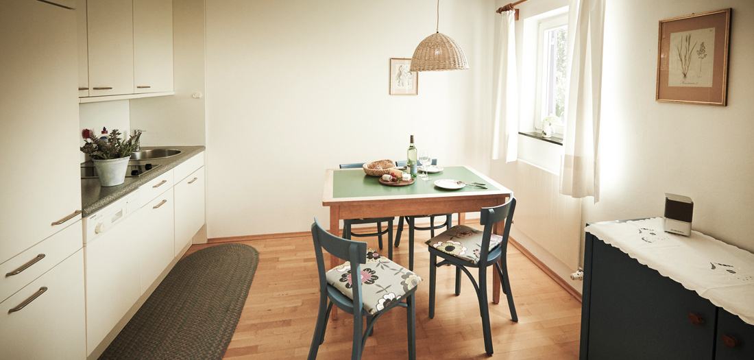 Diese Ferienwohnung ist mit Schlafraum (ein Doppelbett), Dusche/WC und Balkon ausgestattet. Der Wohnraum besteht aus einer Küchenzeile, Essplatz und einer gemütlichen Sitzecke mit Farbfernsehen, Radio und Telefon. Bei Bedarf kann die Couch ausgeklappt werden. Die Küchenzeile beinhaltet ebenfalls eine Kaffeemaschine sowie eine Spülmaschine.