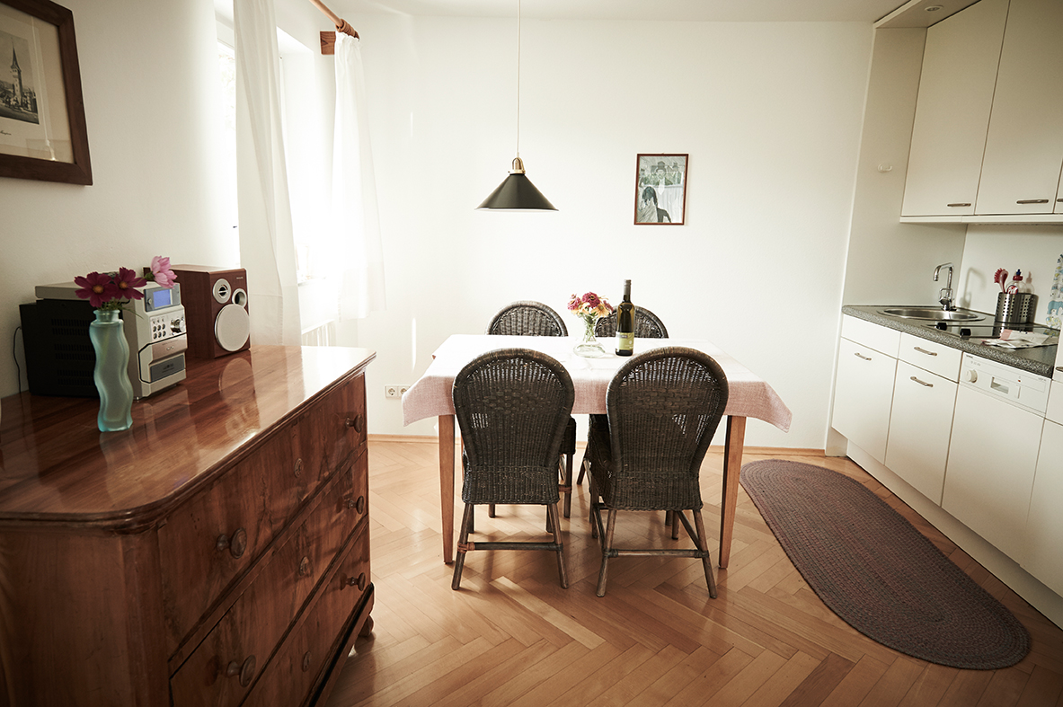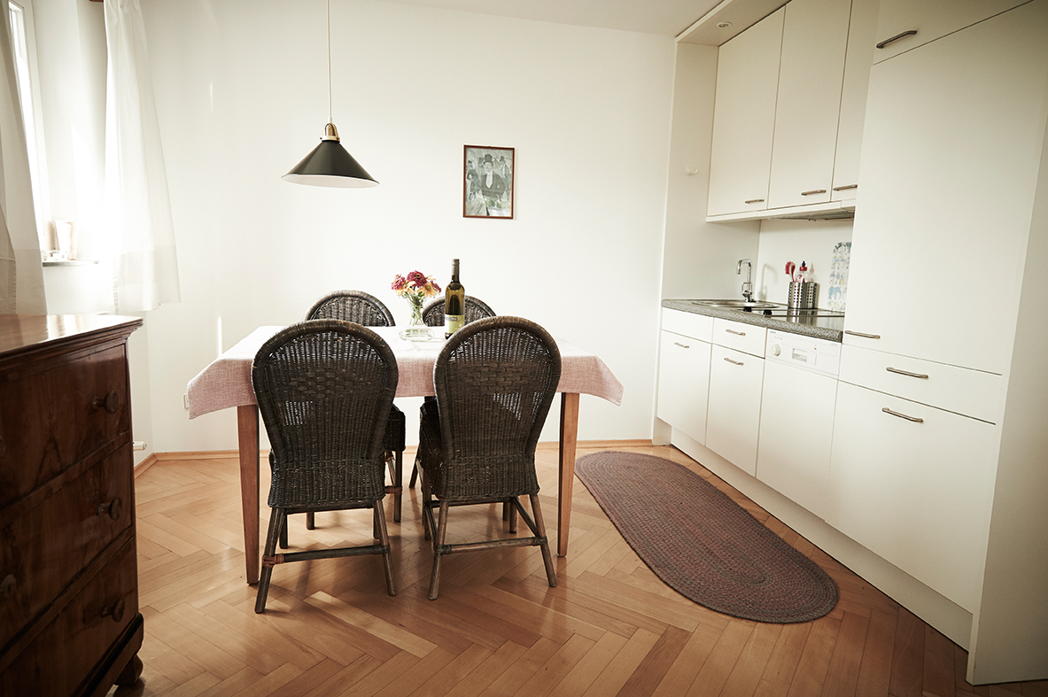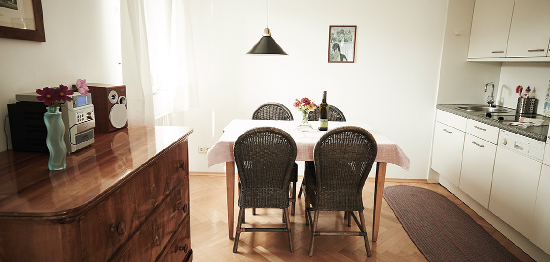 Diese Ferienwohnung ist mit Schlafraum (ein Doppelbett), Bad/WC und Balkon ausgestattet. Der Wohnraum besteht aus einer Küchenzeile, Essplatz und einer gemütlichen Sitzecke mit Farbfernsehen, Radio und Telefon. Bei Bedarf kann die Couch ausgeklappt werden. Die Küchenzeile beinhaltet ebenfalls eine Kaffeemaschine sowie eine Spülmaschine.