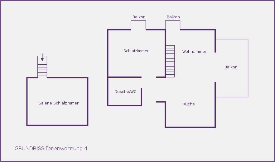 Diese Ferienwohnung ist mit Schlafraum (ein Doppelbett), Bad/WC und Balkon ausgestattet. Der Wohnraum besteht aus einer Küchenzeile, Essplatz, Galerie mit zwei Betten und einer gemütlichen Sitzecke mit Farbfernsehen, Radio und Telefon. Die Küchenzeile beinhaltet ebenfalls eine Kaffeemaschine sowie eine Spülmaschine.